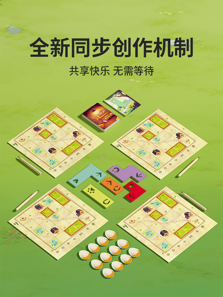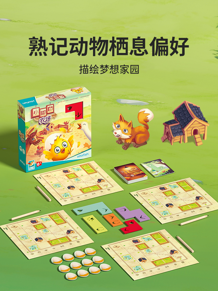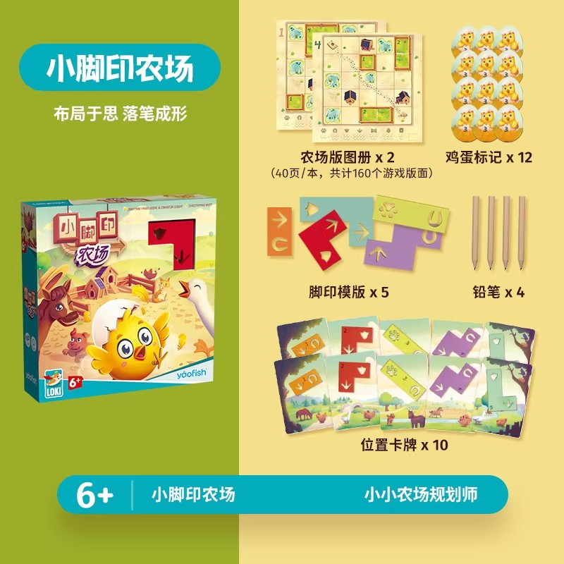 | 农场版图册x2 鸡蛋标记x12 脚印模块x5 铅笔x4 位置卡牌x10 |