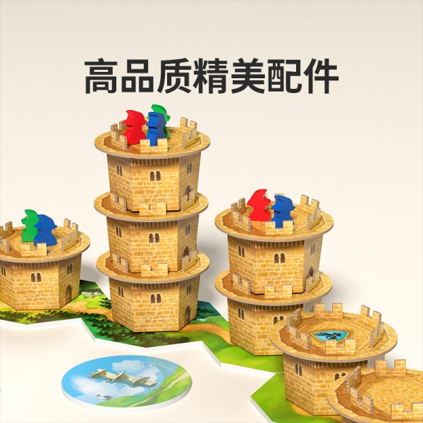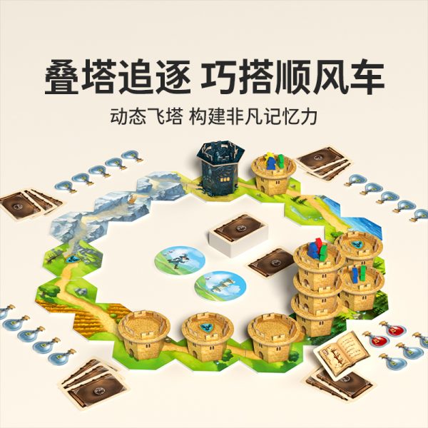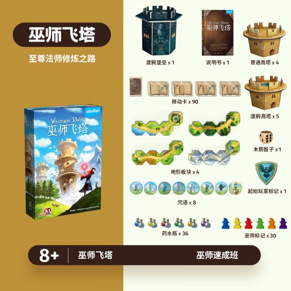 渡鸦堡垒x1 普通高塔x4 移动卡x90 渡鸦高塔x5 地形板块x4 木质骰子x1 咒语x8 起始玩家标记x1 药水瓶x36 巫师标记x30 |
